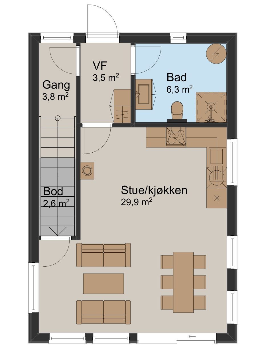 Skagerak er hytta for deg som drømmer om et rolig sted ved vannet Du kommer inn i vindfanget hvor du har tilgang til et romslig bad, trapp opp i andre etasje, gjennomgang til allrommet, og en åpen stue-/kjøkkenløsning med skyvedører fra stuen som leder til terrassen utenfor. Vinduene skaper et lyst og trivelig oppholdsromrom. I allrommet får du plass til et innholdsrikt kjøkken og en spise- og en sofagruppe. Under trappen finner du en praktisk liten bod, hvor du kan lagre ekstra proviant, puter og pledd, eller andre ting som ikke trenger å ligge fremme.